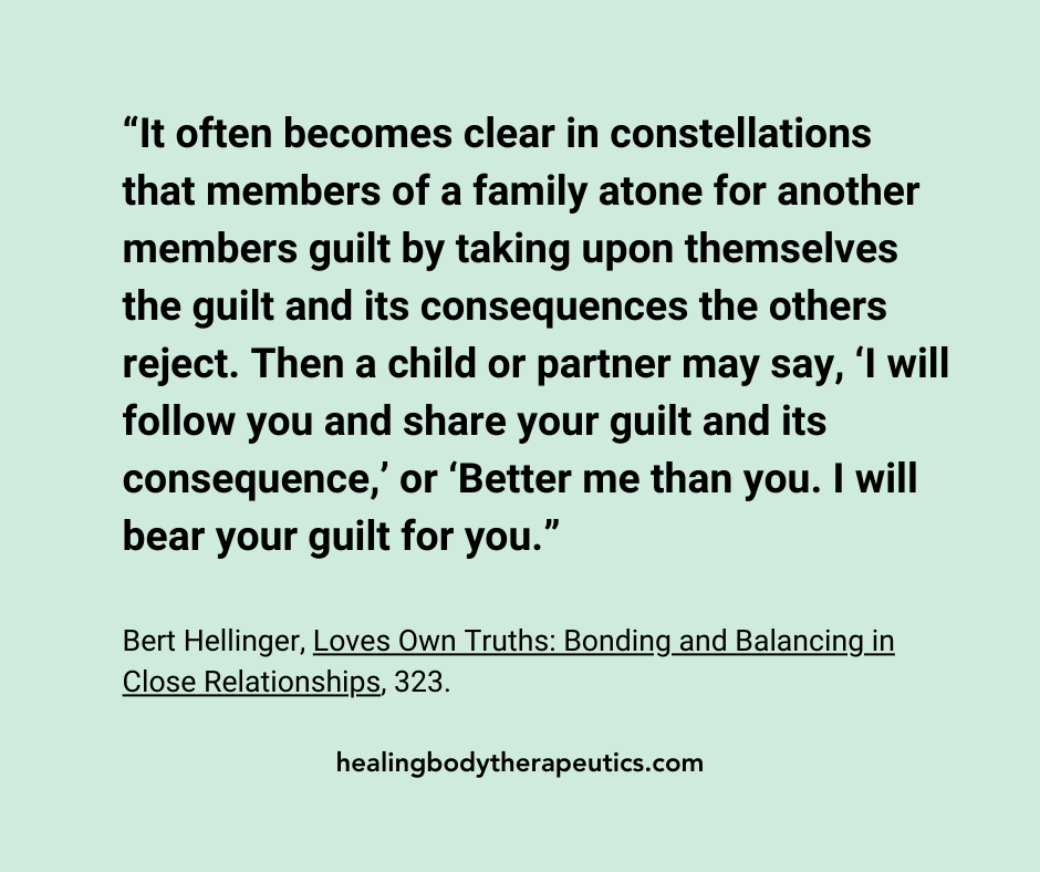 “The family group ‘re-members’ the excluded, the ignored, the forgotten, the unrecognized, the dead. When a legitimate member of the group is shut out, someone is a later generation must compensate for the injustice by suffering a similar injustice. The persons drafted for this service don’t choose their fate. In fact, they usually don’t even notice what’s happening and can’t defend themselves against it. They relive the fate of the excluded person, and recreate the person’s experience, complete with the guilt, the innocence, and all the other feelings that belong to that experience.”
